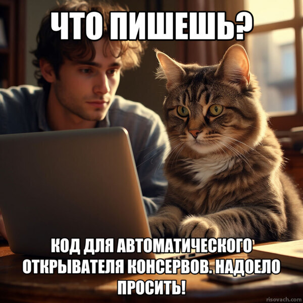 — Пишу код для автоматического открывателя консервов. Надоело каждый раз просить, чтобы меня покормили!
