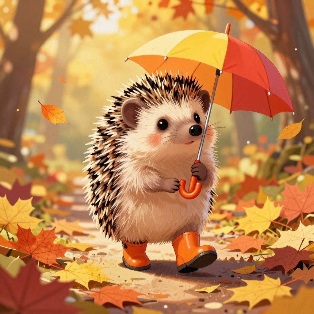 Ежик по имени Пых очень любил осень, но совсем не любил мокрые лапки. Поэтому в этом году он подготовился основательно: достал свои любимые оранжевые сапожки и яркий зонт. Теперь каждый шорох опавших листьев под ногами звучал для него как самая добрая музыка. Пых шел в гости к белке, неся в кармашке самое вкусное яблоко, и улыбался каждому лучу солнца.