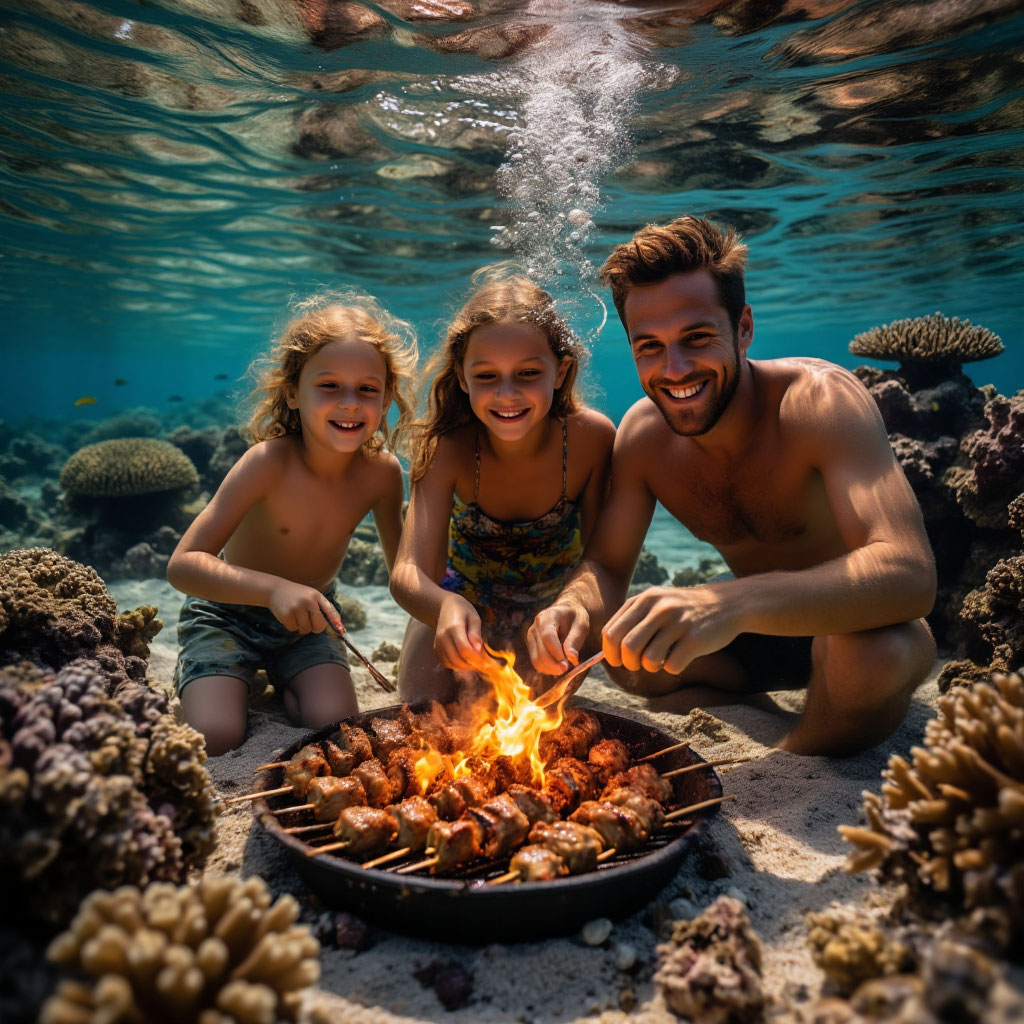 На дне океана, где кораллы и рыбы наблюдают за происходящим с удивлением, счастливая семья решила устроить пикник. Папа, вооружившись щипцами, пытается удержать шампуры, которые норовят уплыть в сторону. Дети, смеясь, пытаются поймать убегающие кусочки мяса, а мама, как настоящий шеф-повар, ловко управляет огнем, который, кажется, вот-вот погаснет из-за пузырьков воздуха.